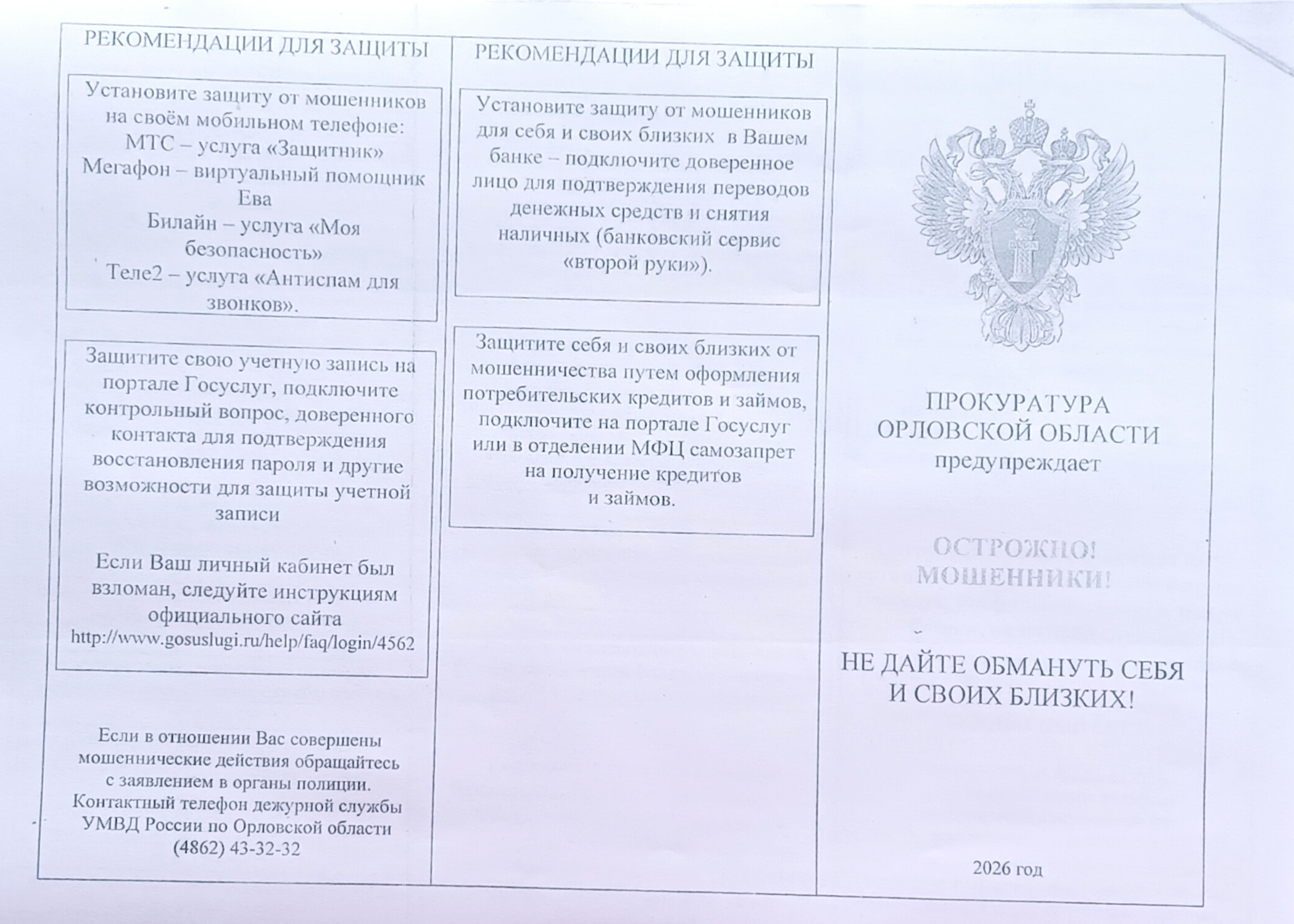 ОСТОРОЖНО! МОШЕННИКИ! Не дайте обмануть себя и своих близких! (Прокуратура Орловской области предупреждает)